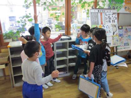 2年生と学校探検をしました。途中、クイズや説明もあり、楽しく学校の中をまわっていました。