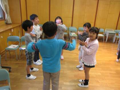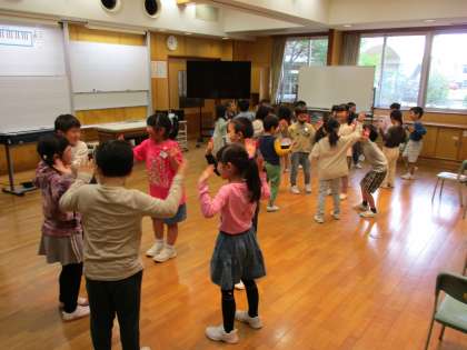 音楽に合わせてダンスをしました。隣の友達と手をたたいたり、リズムに乗って体を動かしたりしました。互いの動きを見合ってまねをしあいながら、楽しんでいました。