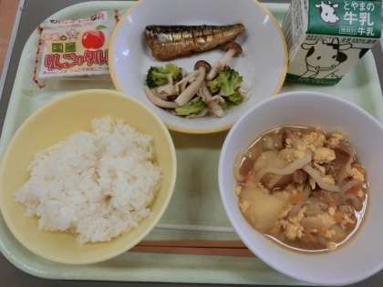 今日の給食は「ご飯、牛乳、いわしのピリ辛煮、ブロッコリーときのこのソテー、卵とじ、お祝いデザート(りんごのタルト)」でした。今日は、給食でも創校150周年をお祝いして、お祝いデザートがついていました。