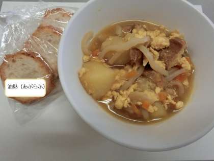卵とじには、宮城名産の油麩を使いました。煮汁をたっぷり含んだ油麩がじゅわっと美味しいくご飯とよく合いました。