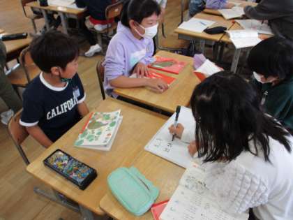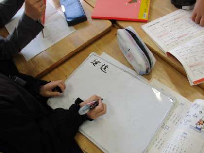 漢字の組み立ての学習では、「かんむり」「たれ」「あし」などの漢字を構成する部分の意味を学びました。意味を知ったあとは、グループで協力して漢字を集めました。
