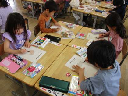 1年生は、あさがおを育てます。今日は、種をじっくり観察しました。色や形をよく見てカードを書きました。