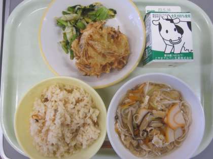 今日の献立は「富富富の五目ご飯、牛乳、白エビのかき揚げ、とろろ昆布和え、大門そうめん汁」でした。今日はサミット給食「日本」でした。