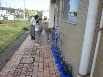 2年生も昨日植えた自分の野菜の水やりを頑張っています。