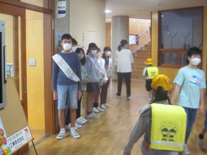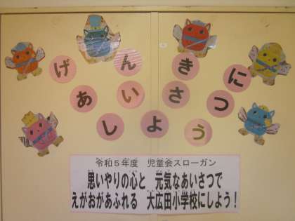 今年度のスローガンです。 毎朝、あいさつ運動を頑張っています。