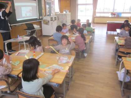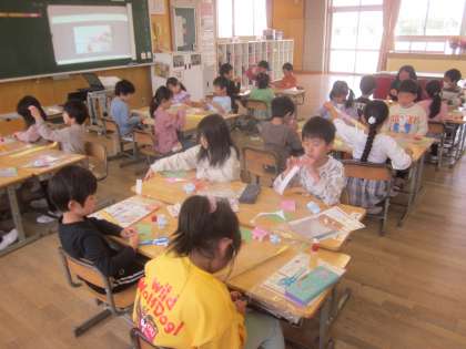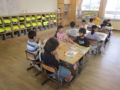 図画工作科では、はさみを使って紙をいろいろな形に切って、つなげたり、重ねたりしながら活動を楽しみました。