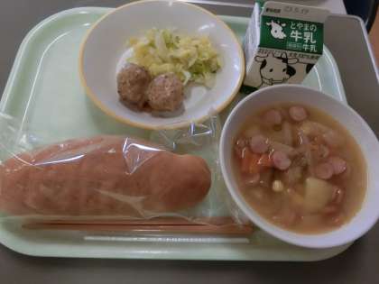 今日の献立は「ライ麦パン、牛乳、フリカデレ(一口ハンバーグ)、ザワークラウト(キャベツの漬物)、アイントプフ(具だくさんスープ)」でした。今日はサミット給食の最終日「ドイツ」でした。フリカデレは、給食室の手作りのハニーマスタードソースがかけてあり、おいしくいただきました。世界の献立を楽しくおいしく味わいました。