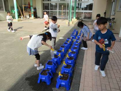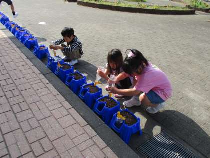朝の準備が終わった子供から、あさがおの水やりをしています。早く芽が出ないかな。