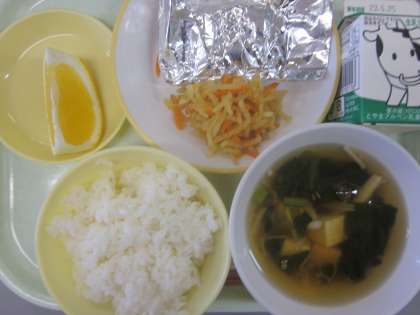 今日の献立は「ご飯。牛乳、サバの銀紙焼き、大根のきんぴら、すまし汁、河内晩柑」でした。