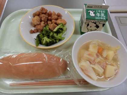 今日の献立は「米粉コッペパン、牛乳、鶏肉とひよこ豆のカレー風味、ゆでブロッコリー、野菜のスープ煮」でした。カラッと揚げた鶏肉とひよこ豆をカレー風味のたれで和えてあり、子供たちにも大人気のメニューでした。