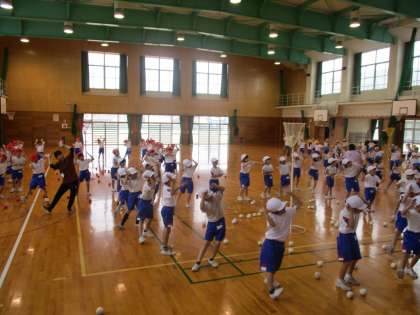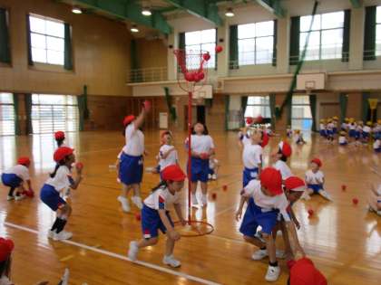 1、2年生は、玉入れの練習をしました。「ジャンボリーミッキー」の曲に合わせ、元気いっぱいにダンスをしました。玉入れでは、どうしたらかごに玉が入るかを考え、ボールを高く投げる練習をしました。