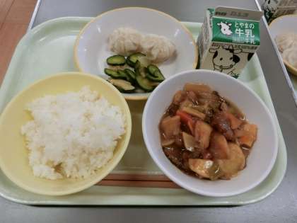 今日の献立は「ご飯、牛乳、酢豚、えび包子(パオツ)、華風和え」でした。酢豚に使われている酢には、食欲増進の効果や疲れた体を回復させる働きがあります。今日は、酸味のきいた酢豚をおいしくいただきました。