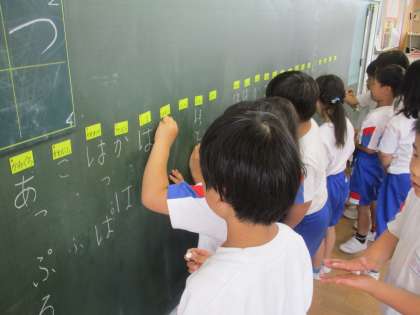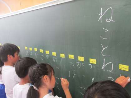 国語科の「ねことねっこ」の学習で、小さい「っ」のつく言葉を見つけました。ノートや黒板に、正しく書いたり、読んだりしました。