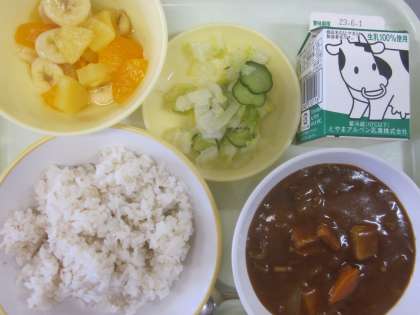 今日の献立は「麦ご飯、牛乳、食べキリンハヤシ、白菜サラダ、フルーツミックス」でした。