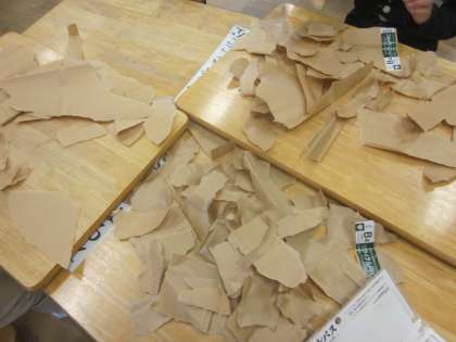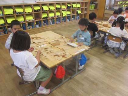 紙を破いて、破いた形からイメージしたもの(乗り物、食べ物など)を話し合いました。
