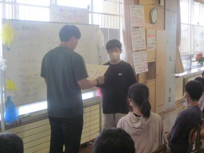 6年生独自の賞です。運動会に向けて、時間を守ること、話をしっかりと聴くことなどの項目があり、その点数が高かった赤団に広運賞が担任から渡されました。