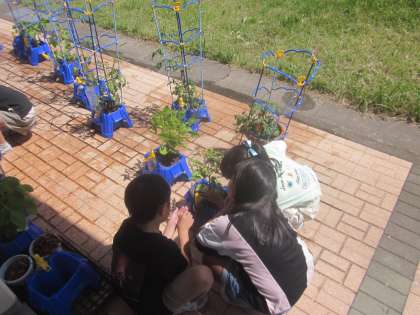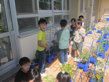 花が咲き、実がなりそうです。子供たちは毎日、熱心にお世話をしています、