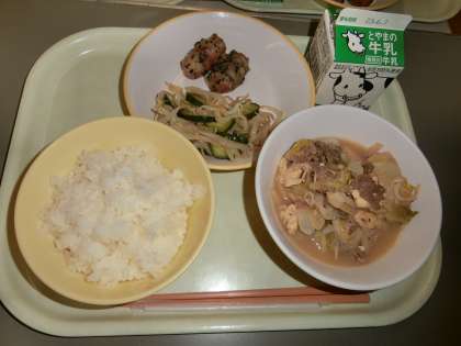 今日の献立は「ご飯、牛乳、ちくわの南部揚げ、甘酢和え、すきやき」でした。今日のすきやきには、牛肉、はくさい、ねぎ、えのきだけ、焼き豆腐、つきこんにゃく、すきやき麩が入っています。たっぷりの野菜とお肉、豆腐が一度に食べられて栄養たっぷりのおいしいすきやでごはんがすすみました。
