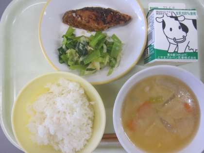 今日の献立は「ご飯、牛乳、魚の竜田揚げ、小松菜漬し、ご汁」でした。