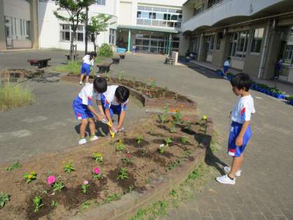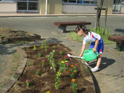1年生は、登校したらまず、提出物を出したり着替えをしたりしています。その後、あさがおの水やりをしていますが、今日からは花壇のお世話も始まりました。植物を大切にする姿です。