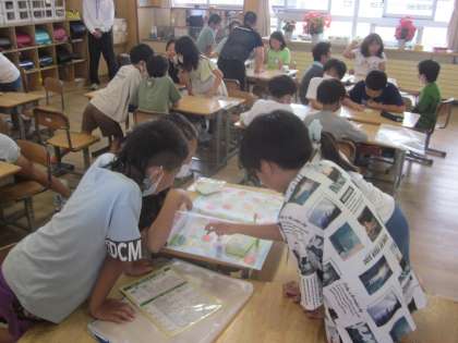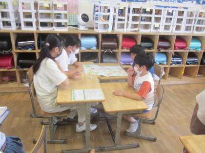 富山市役所環境政策課から講師をお招きして、出前授業を行っていただきました。お話を聞いた後、環境すごろくに取り組みました。
