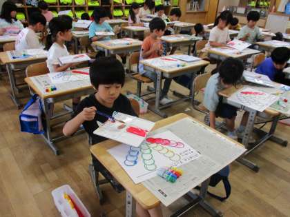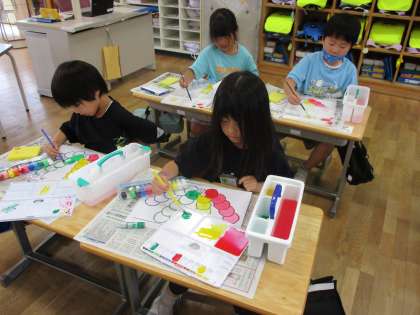 図画工作の時間は、水彩の使い方を学習しました。水をうまく使うことで、色の濃さが変わることに気付き、子供たちは驚いていました。