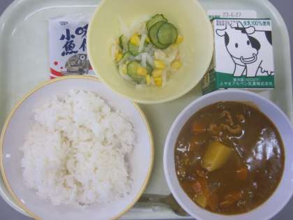 今日の献立は「ご飯、牛乳、カレー(カレーライス)、大根サラダ、味付け小魚」でした。