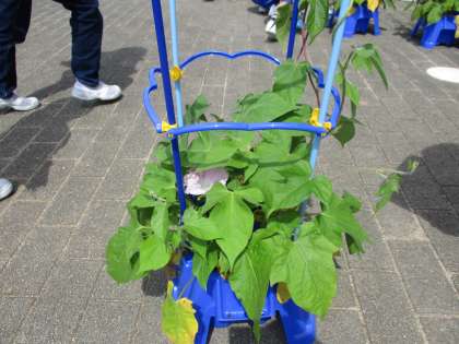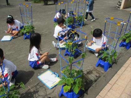 国語の時間に、自分のあさがおをじっくり見て、絵と文章で表しました。「かず・いろ・たかさ・てざわり」など、それぞれの項目についてくわしく書きました。中には、もう花が咲いている子供もおり、成長を喜んでいました。