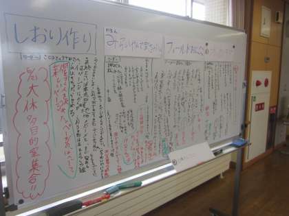 学年のオープンスペースにあるホワイトボードには、各担当の計画やお知らせがぎっしりと書かれています。来週の校外学習が楽しみです。