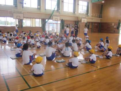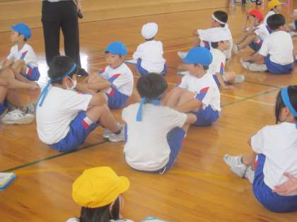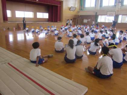 6年生が1年生の反復横跳びと上体起こしのサポートをしました。