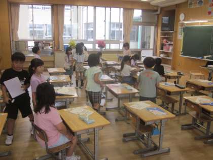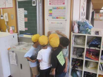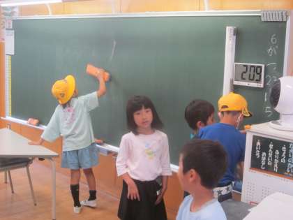 帰りの準備の後に、自分の仕事に取り組んでいます。黒板消し、窓閉め、配り物など、責任をもって仕事をしています。