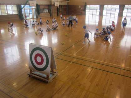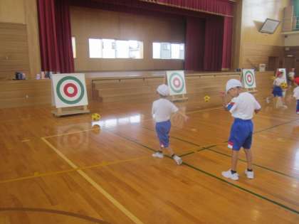 柔らかいボールを的に向かって蹴っています。うまく当たるかな。