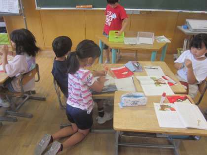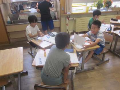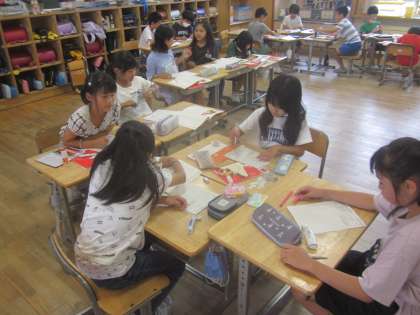 物語に登場する人物の心の動きを教科書の文章から読み取っています。グループの仲間と確認しながら進めています。