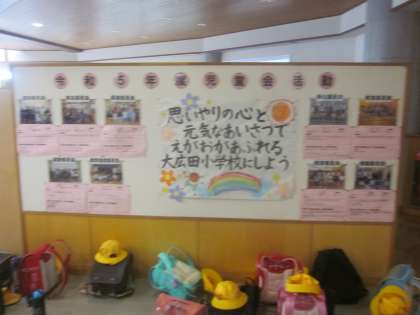 児童玄関に各委員会の紹介カードと今年度のスローガンを掲示しました。ご来校の際には、ぜひご覧ください。