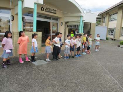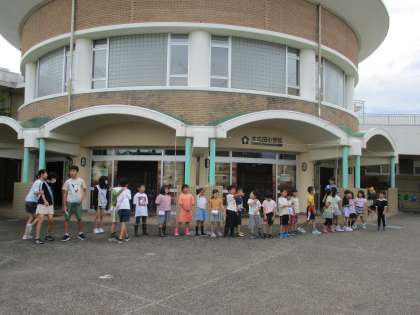 今日のあいさつバトンは1年1組でした。子供たちは登校後、玄関前で元気にあいさつをしていました。