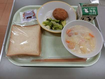 今日の献立は「食パン、牛乳、メンチカツ、グリーンサラダ、白花豆の米粉シチュー、いちごジャム」でした。白花豆は大きくやわらかくホクホクとした豆で、甘みもありシチューをおいしくいただきました。