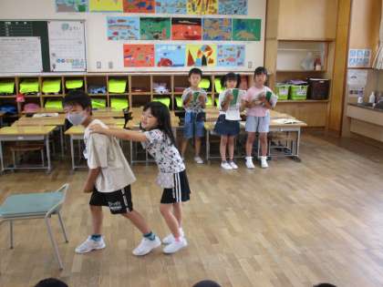 グループごとに「おおきなかぶ」の音読練習をしています。動きをつけて、登場人物の気持ちを表現しました。最後は動画撮影する予定です。