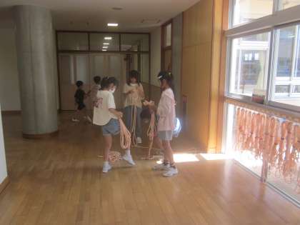 5年生の水遊びチームは長縄跳びの片付けをしていました。