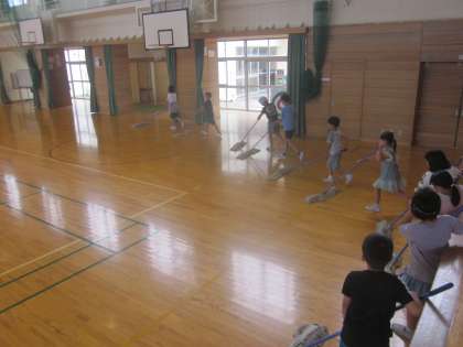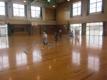 現在、特別研修期間です。月・水・金は清掃、火・木は昼休憩としています。今日は清掃です。アリーナの「モップ隊」は整然とモップがけをしていました。