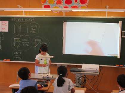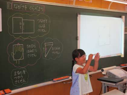ものさしを使わずに、紙の縦と横の長さをくらべるにはどうしたらよいかを話し合いました。実物を使って説明する力が身に付いています。