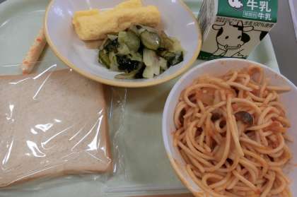 今日の献立は「減量食パン、ツナとトマトのスパゲッテイ、卵ロール、海藻サラダ、棒チーズ、牛乳」でした。スパゲッテイに使用したトマトは、福井県の完熟トマトを使いました。うま味もたっぷりでおいしかったです。