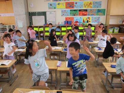 「おむすび ころりん すっとんとん」の場面を、踊りながら音読しました。言葉をリズムよく言うと、気分が楽しくなります。
