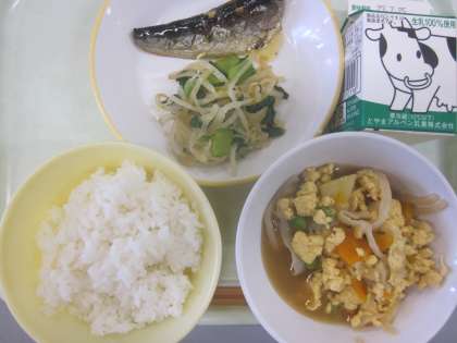 今日の献立は「ご飯、牛乳、鰯のマーマレード煮、チンゲンサイひたし、高野豆腐の錦とじ」でした。