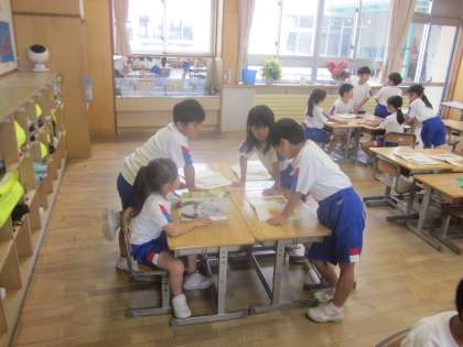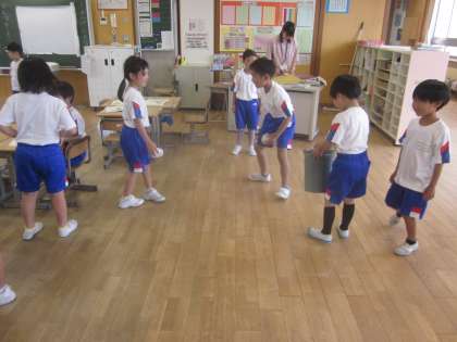 紙を丸めておむすびをつくり、どんなふうに音読するかを決めています。