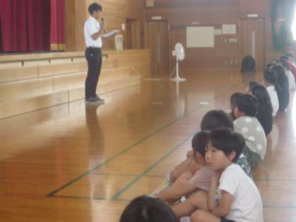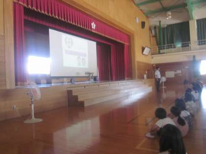 生徒指導主事と情報主任が交通安全、遊び方、クロムブックの使い方の話をしました。