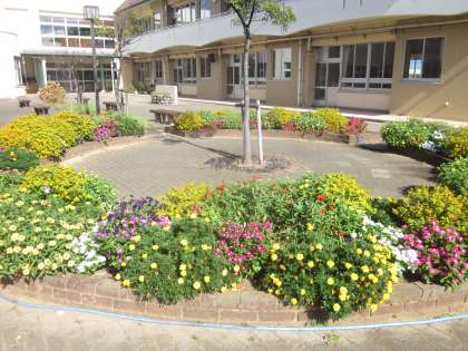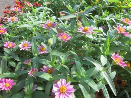 昨日の雨を受けて、今日も花壇の花たちはきれいな色の花を咲かせています。虫たちも蜜を求めて飛び回っています。