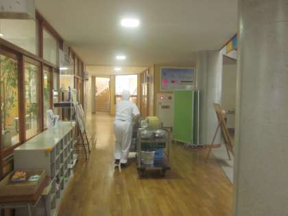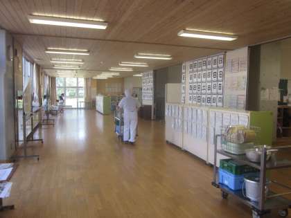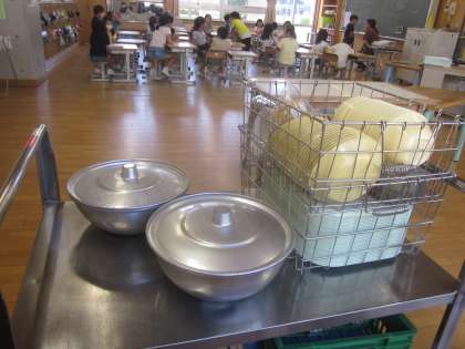 調理員さんが運搬車を運んでいると、子供たちは大きな声で「ありがとうございます!」と言っていました。