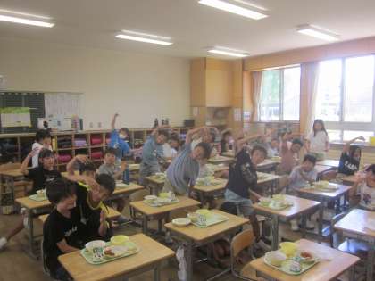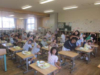 「2学期の給食も、おいCー」 久々のポーズでしたが、すごくそろっていました。
