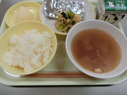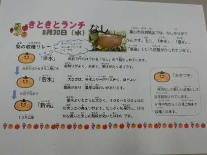 今日の献立は「ご飯、牛乳、さばの銀紙焼き、はりはり和え、冬瓜スープ、梨」でした。今日のきときとランチは「梨」です。今日の梨は、富山市内の呉羽地区で育てられた「呉羽梨」の「幸水」という品種でした。甘みもあり、みずみずしい梨をおいしくいただきました。