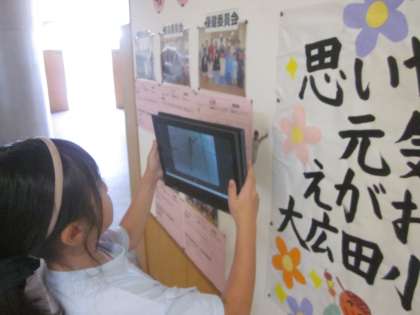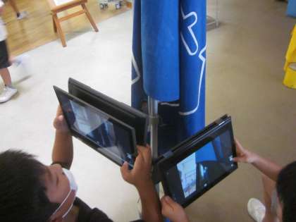 いろいろなポーズをした自分の写真を、校内のいろいろな場所に置きました。友達と見付け合いっこをしています。旗に上っているようなボーズ、小さくなって隠れているようなポーズ、ポーズと置いてある場所がうまく合っていてとてもおもしろいです。